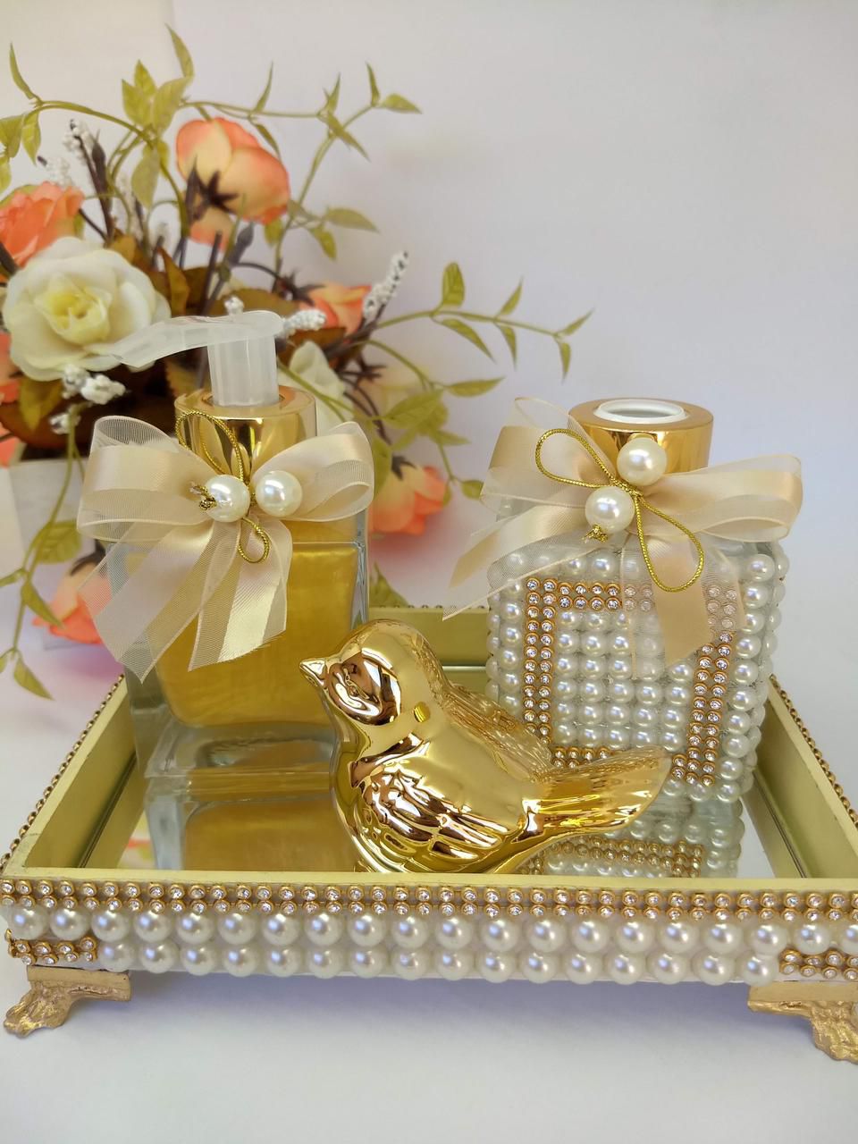 ! KIT CONTENDO: 1 vidrdifusor de 100 ml 1 vidrsabonete liquido de 100 ml 2 varetas decoradas 1 bandeja1 passarinho