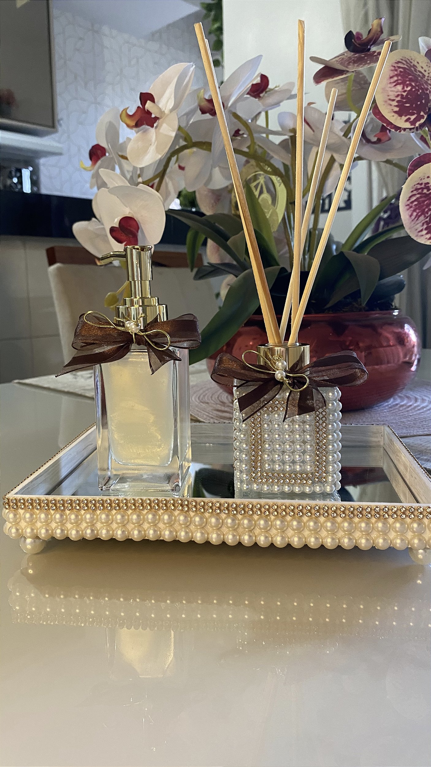 - 1 bandeja espelhada com pés de resina (10x20cm), decorada com pérolas e strass